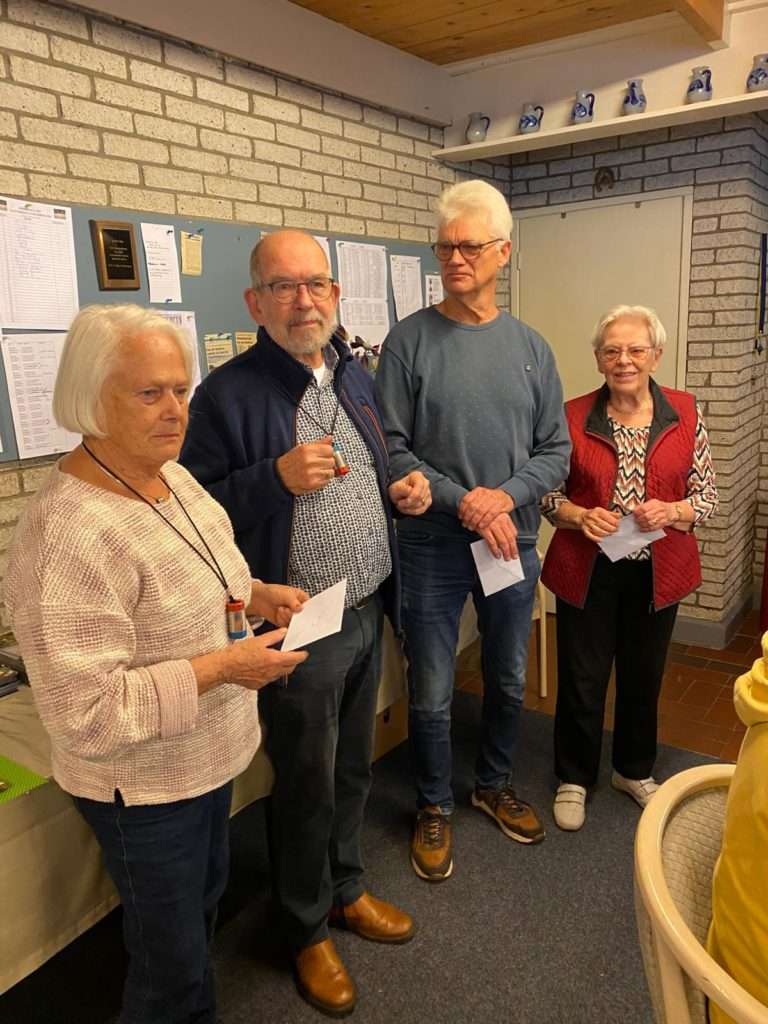Prijzen: 1e prijs Jan Ooms, 2e prijs werd gedeeld door Petra Waterink en Henk Horden. De twee verlotingsprijzen gingen naar Bram Suithoff en Gerritjan Wendt, De troostprijs was voor Nico Wassens. Allen gelukgewenst!